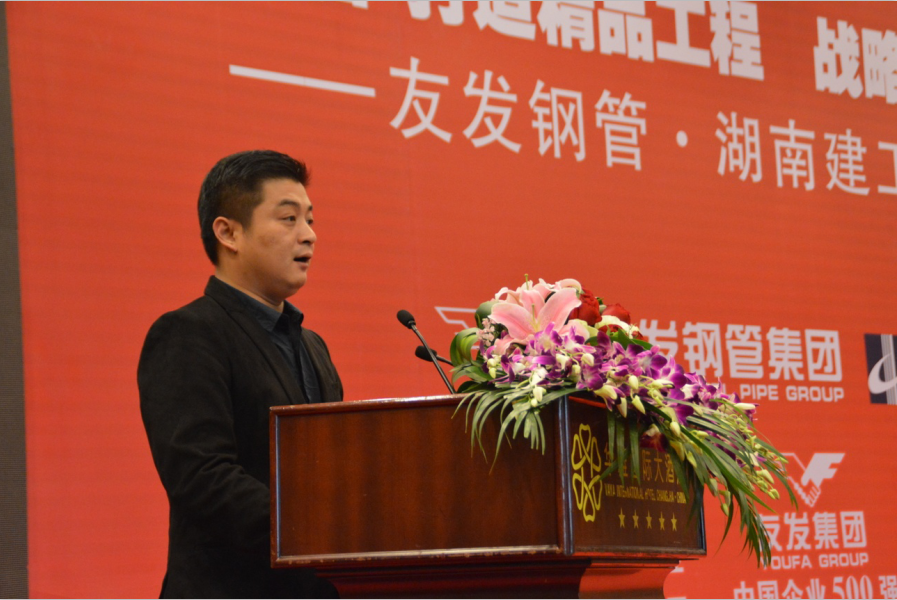 友发钢管集团总裁尹九祥在讲话中介绍了友发争做行业领跑者、坚持创新整合和对社会高度负责任的公司经营理念,并就实力与品牌、产品质量、采购价格和整体服务等采购方关心的问题进行了介绍和承诺。他表示,友发将凭借完善的服务体系和资源,为湖南建工集团打造更多优质工程做好坚实后盾,友发也深切希望能与众多朋友携手,共同实现互利共赢。